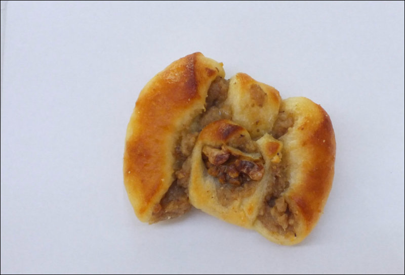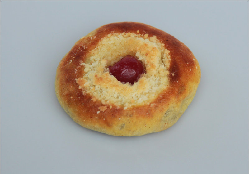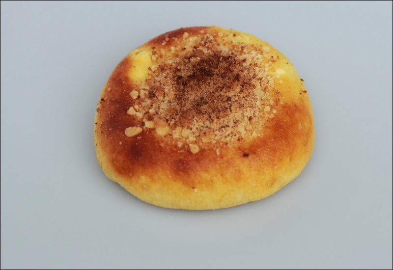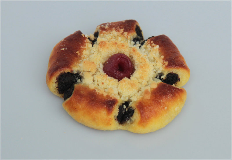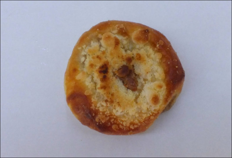 Tvarohovýkoláčzkynutéhotěstas rozinkaminamáčenýmivrumu, zdobenýpovidlyamandlemi.Váha koláče je 88 gramů.