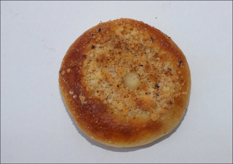 Tvarohovýkoláčzkynutéhotěstas rozinkaminamáčenýmivrumu, zdobenýtmavouposypkou.Váha koláče je 84 gramů.